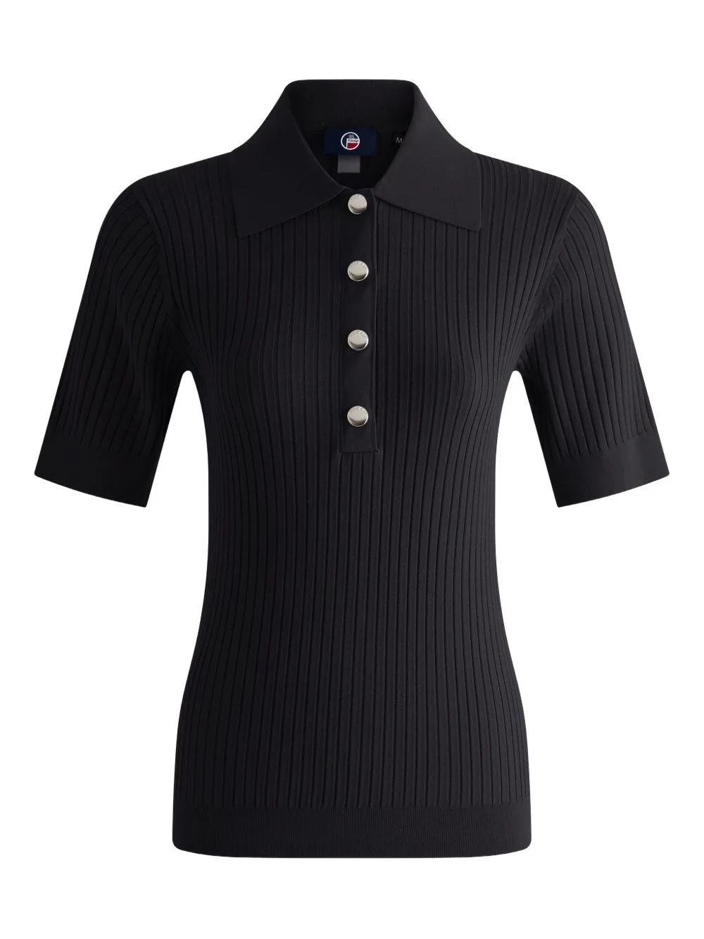 Vera polo top Highlights - Black - Front button placket - Ribbed knit - Polo collar - Short sleeves Imported Composition Viscose 83%, Polyester 17% Washing instructions Machine Wash