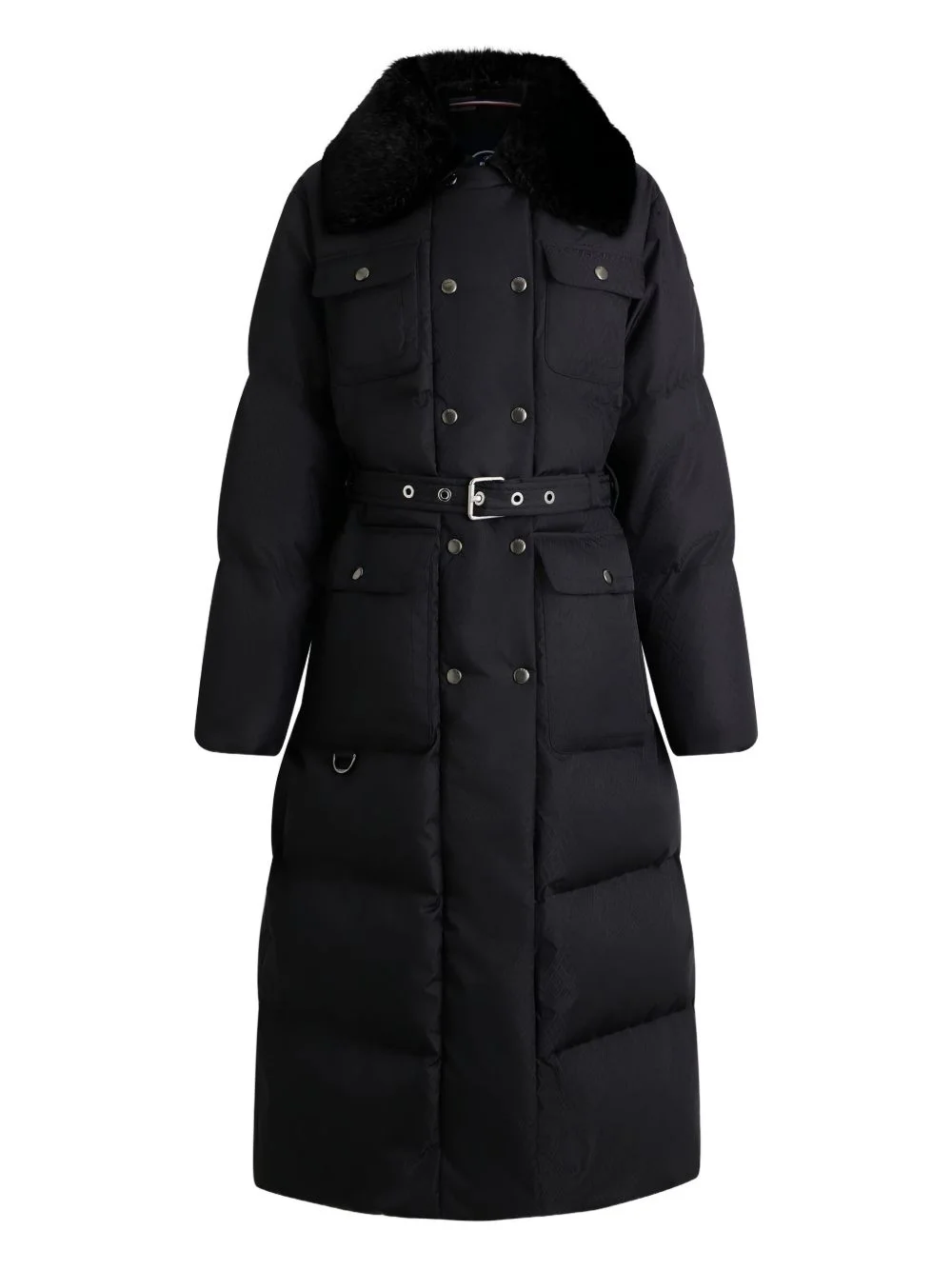 Vlavi removable-collar belted coat Highlights - Black - Removable faux-fur collar - Removable belt - Multiple pockets Imported Composition Outer: Artificial Fur 100%, Polyester 74%, Polyurethane 26% Lining: Polyamide 100%, Duck Down 80%, Duck Feathers 20%