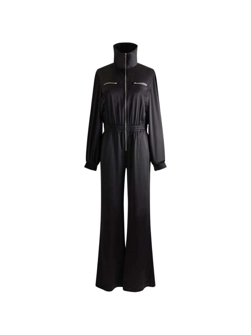 zip-up cuffed jumpsuit Highlights - Black - Zip fastening - Cuffed sleeves - High neck - Flared leg Imported Composition Silk 90%, Elastane 10% Washing instructions Read Manufacturer Guidelines
