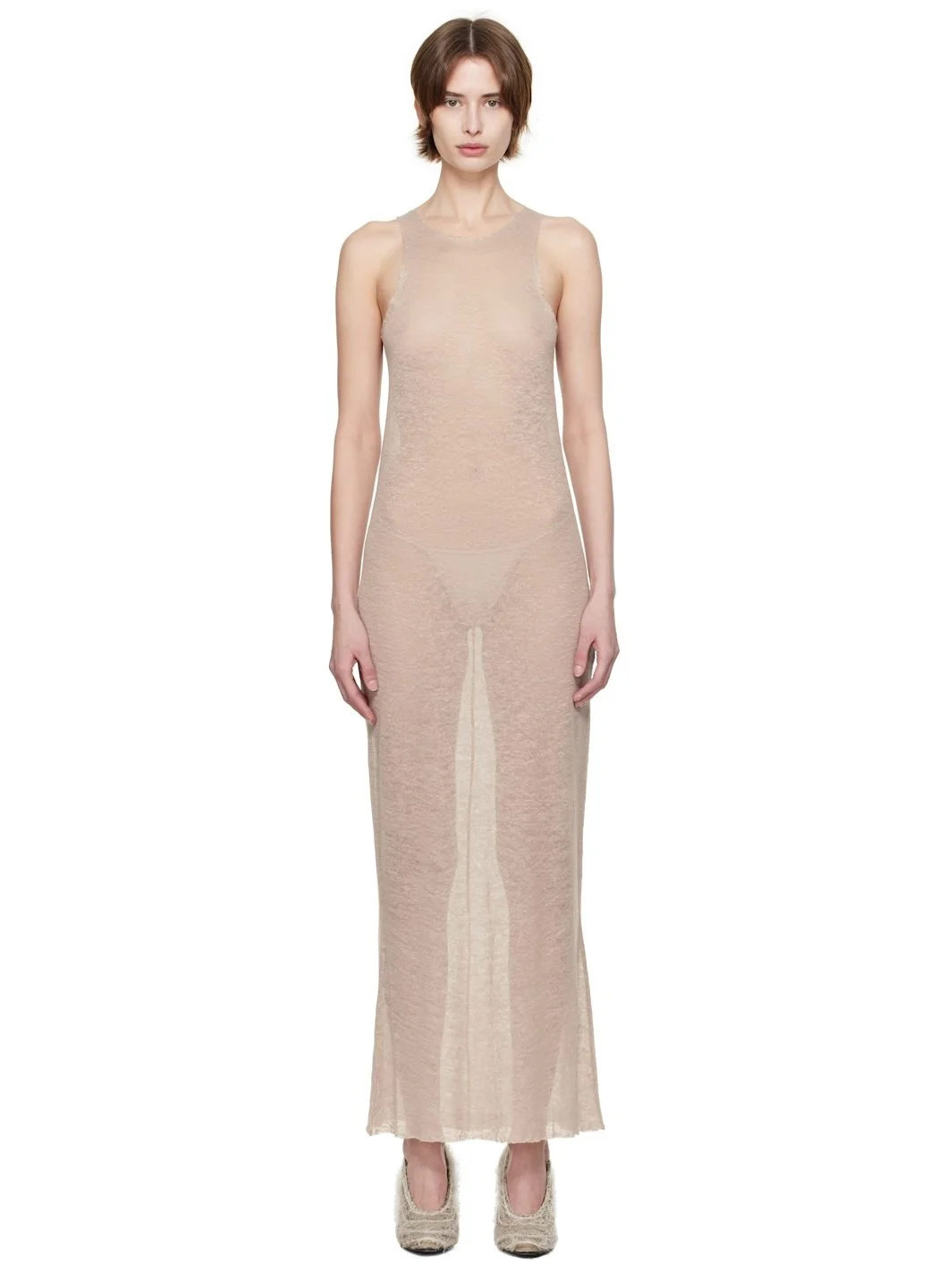 Semi-sheer linen jersey maxi dress. · Raw edge at crewneck, hem, and armscyes · Central seam at back Supplier color: Warm grey 100% linen. Made in Spain 251282F054001