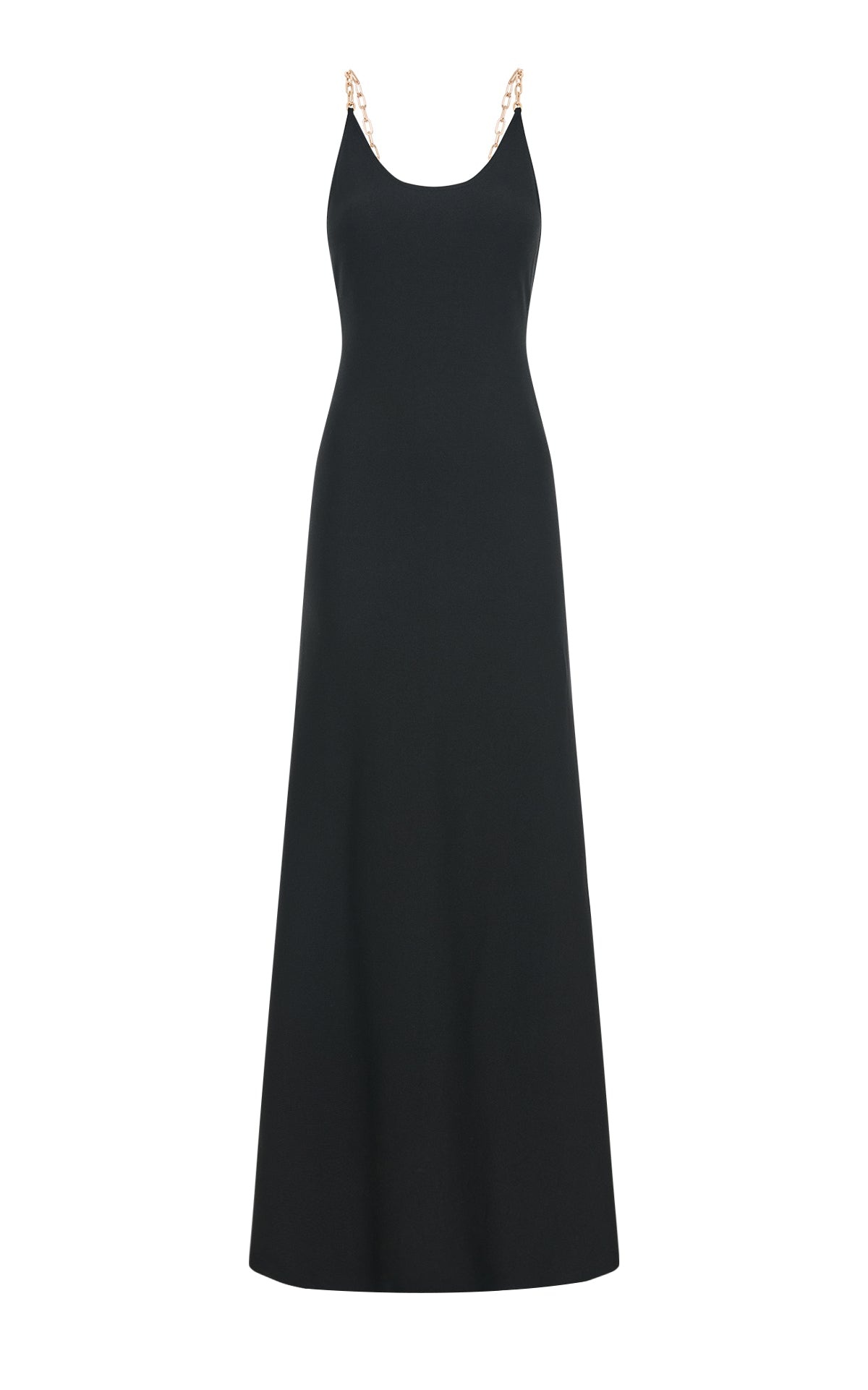 Knit in 100% silk interlock, the Adeona Dress has extra long chain link shoulder straps that elegantly drape down the back of the dress. The fabric was created to support and flatter the figure. The fit is slim through the body and hips and widens at the sweep. Details: - 100% Silk - Made in Italy