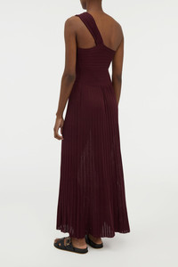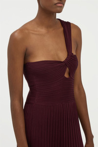 A striking one-shoulder gown with a twisted front and keyhole cutout. The fitted bodice flows into a sheer pleated skirt for elegant movement and subtle texture. Details: - 100% Silk - Maxi-length - One-shoulder neckline - Sleeveless - Invisible side zipper - A-line silhouette - Made in Italy