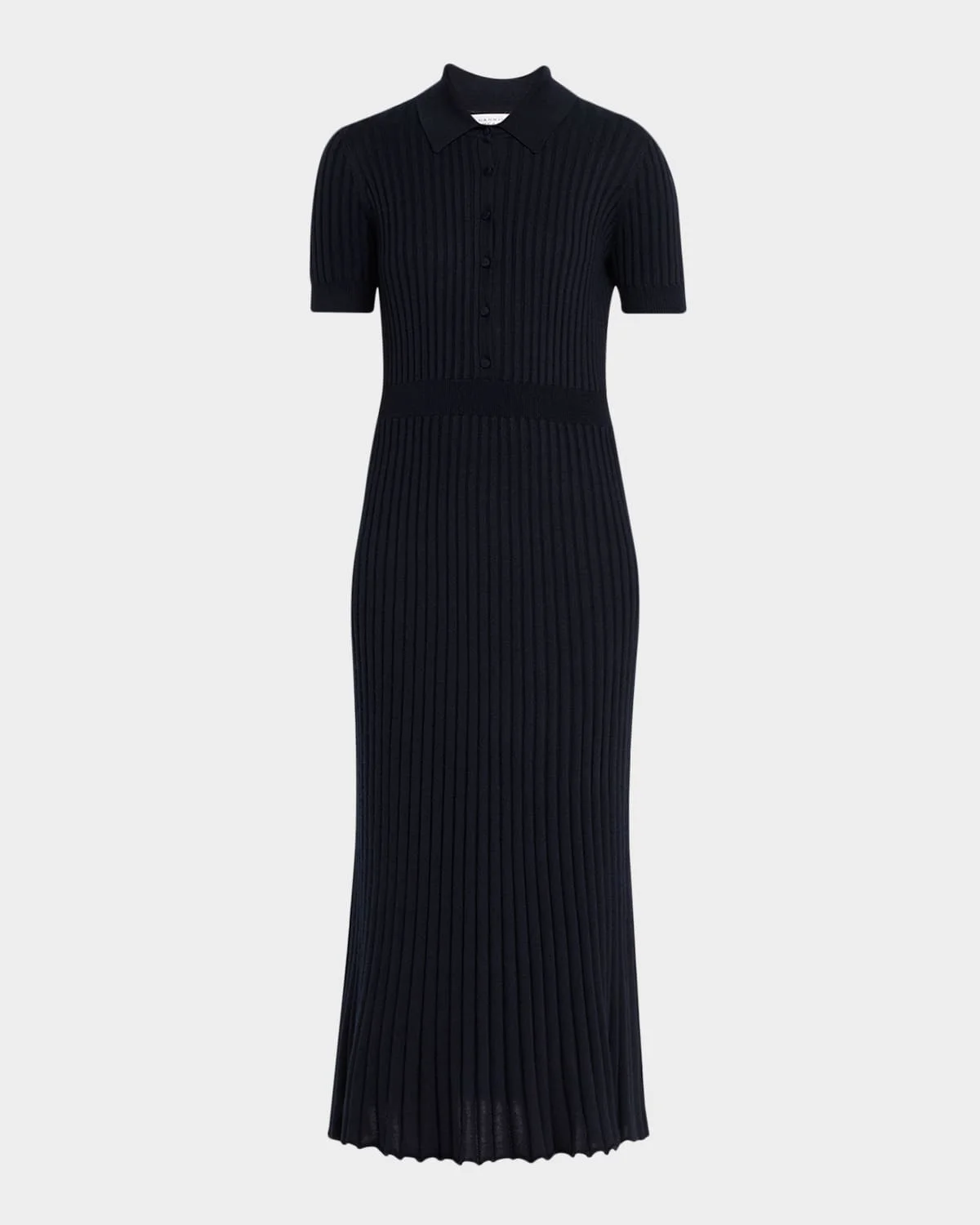 Gabriela Hearst "Amor" ribknit polo dress Spread collar; halfbutton front Short sleeves Cinched waist Aline silhouette Full length Slipover style Cashmere/silk Imported