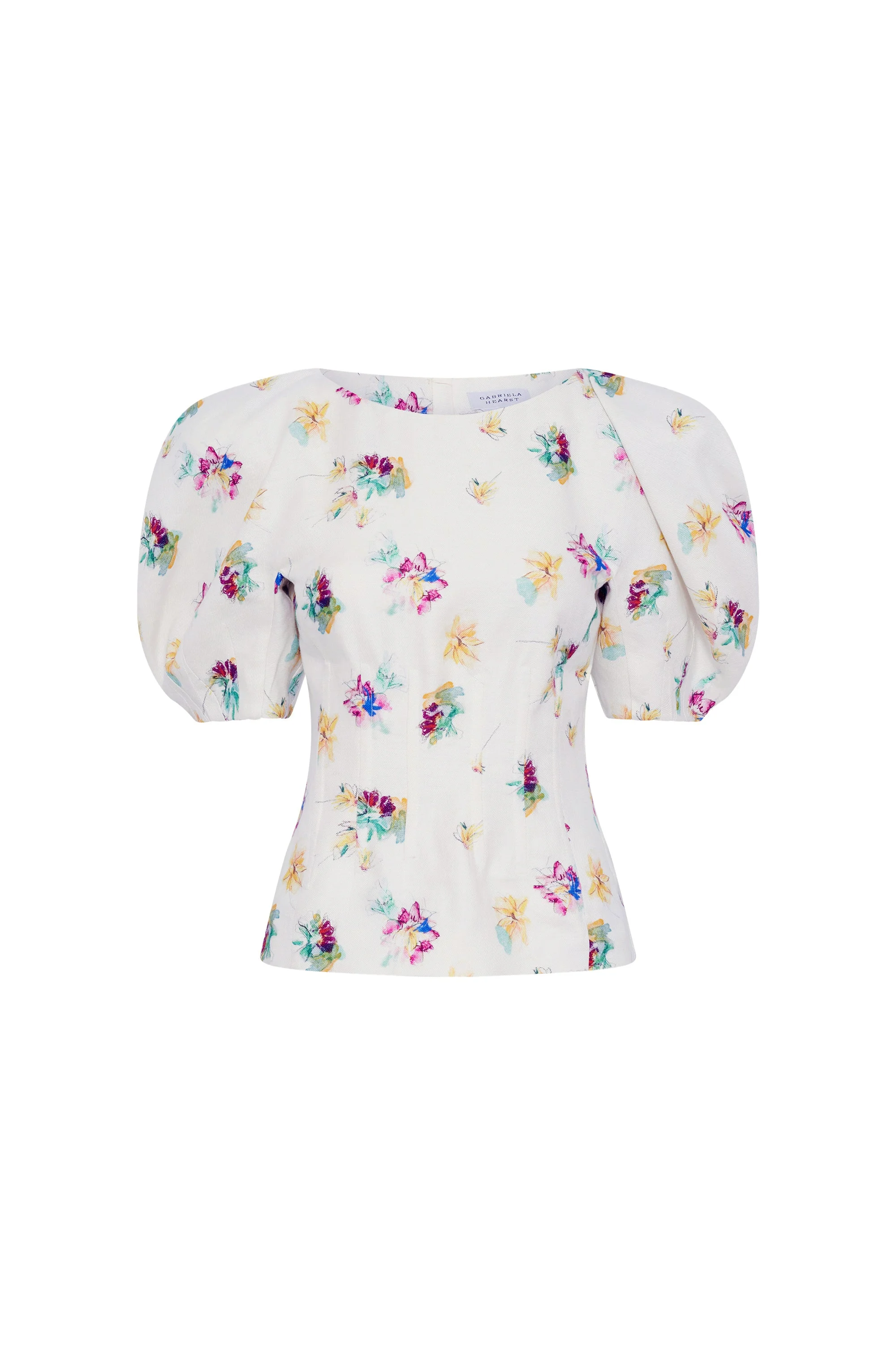 Ayelet Puff Sleeve Mia's Flowers Top in Ivory Multi Printed Linen Twill