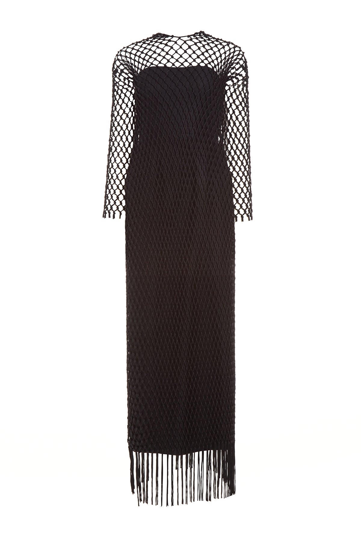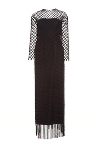 The Barnett Dess with Silk Macrame is a simple black dress with macrame dress worn over with fringe detail at the hem. Details: - 83% Wool , 17% Silk - Made in Italy Size and fit: Relaxed fit. Fits true to size. Model is 5'11" and wearing a size IT38.