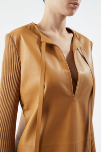 The Beko Tunic Dress in Dakota leather juxtaposes the idea of a slim, sharp silhouette with a fluted, pleated, knitted sleeve. Traditionally crafted and finished with a self neck-tie with metal cord ends. Details: - 100% Dakota Leather (Lambskin) / 100% Cashmere - Made in Italy Size and Fit: Fits true to size. Model is 5'11" and wearing a size 38.