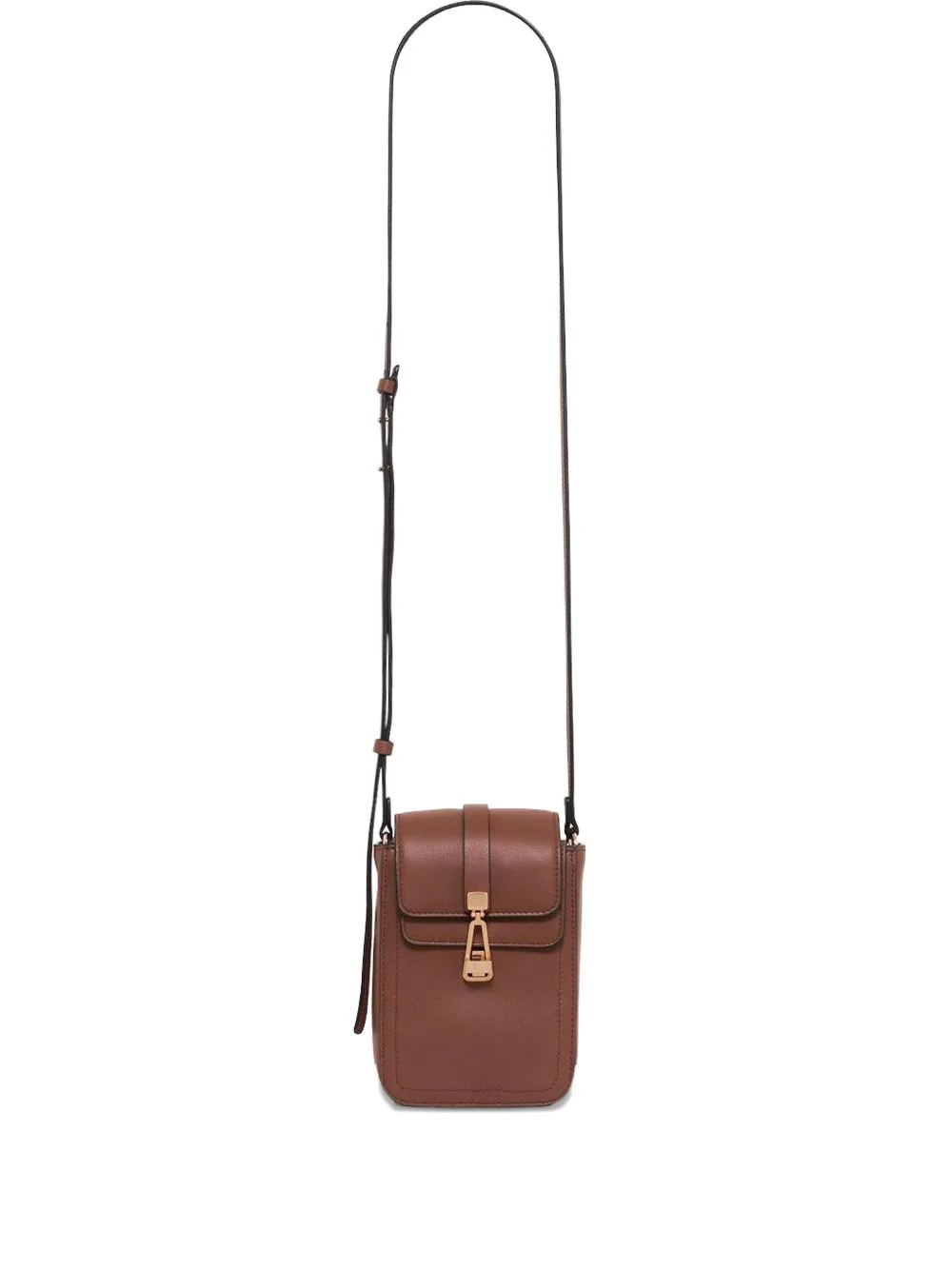 buckled leather phone holder Highlights - Cognac brown - Adjustable shoulder strap - Front flap closure - Buckle fastening - Gold-tone hardware - Rectangular shape Made in Italy Composition Outer: Lamb Skin 100% Lining: Lamb Skin 100%