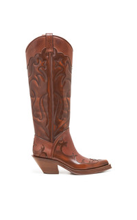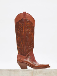 A new cowboy boot, named the Capitana, is revisited with sleek modern lines and a layered sole - featuring a block heel with a flame-inspired details on the shin. Details: - Heel height 50mm | 2 inches - 100% Calf leather upper - 100% Calf leather sole - Pointed toe - Stitching detail - Italian sizing - Made in Italy Size and Fit: Fits true to size.