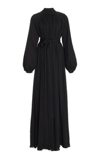 The Gabriela Hearst Cedric dress flows elegantly from the high-neck collar with delicate tucks that fall dramatically to the sweep. A self-belt cinches this style in at the waist. This style exudes an easy grace. Finished with self-button cuffs and neckline. Details: - 100% Silk - High-neck - Belted-waist - Floor-length hem - Self-button neckline and cuffs - Relaxed fit - Made in Italy Size and fit: Relaxed fit. Fits true to size. The model is 5'11" and wearing a size 38.