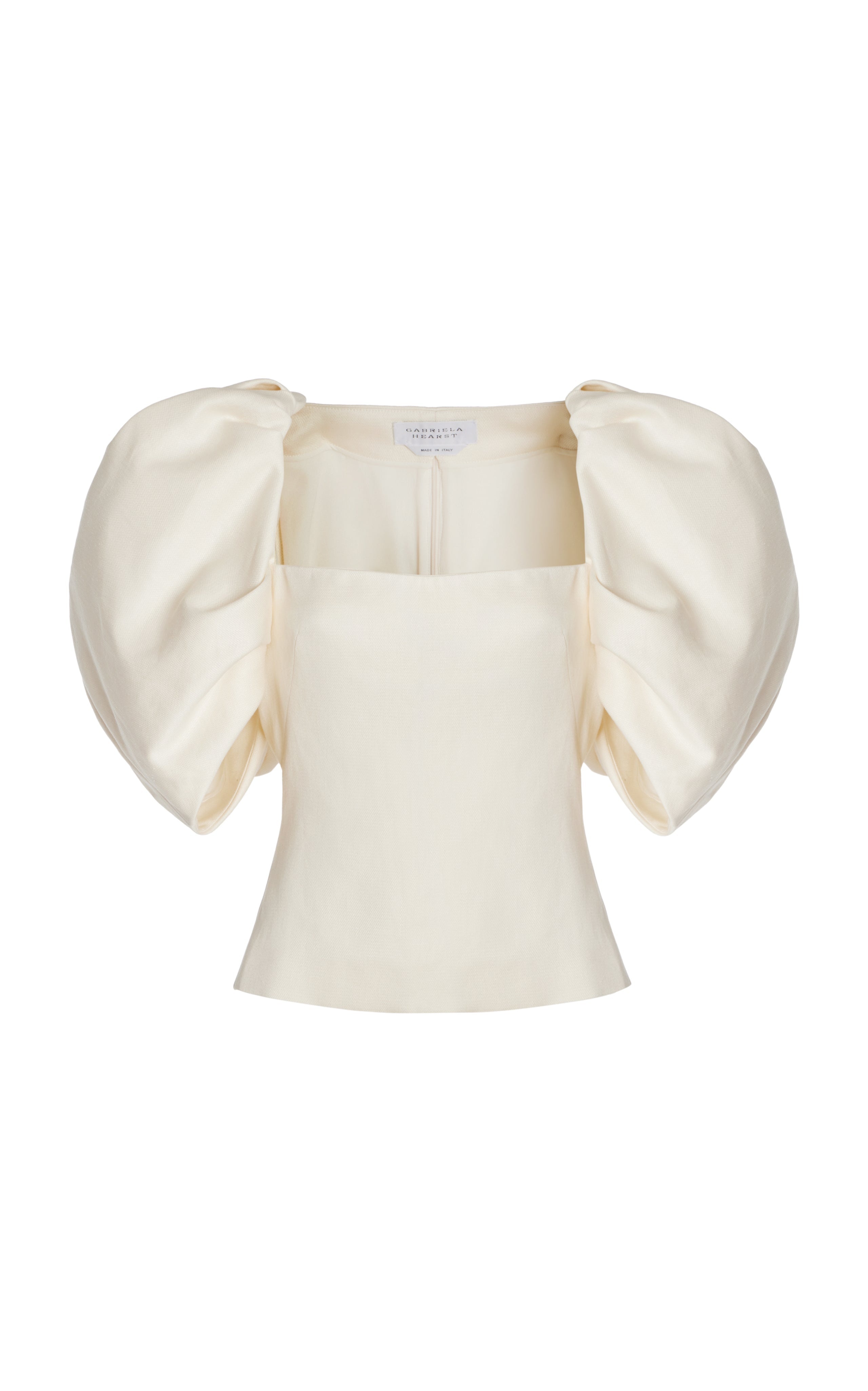 A dramatic, beautifully formed, and sculpted full sleeve is contrasted against a fitted bodice shape in the Ceri top. The rich textured linen slub adds to the perfect synergy of all elements, creating a perfectly bold, playful piece. Details: - 100% Linen - Puffed-sleeves - Cropped Length - Made in Italy Size and Fit: Fits true to size. The model is 5'11" and wearing a size 38.