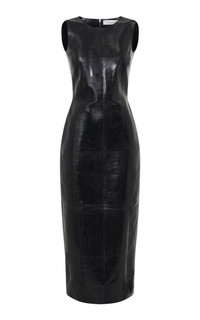 The Cinta Dress is sculpted in Teju leather to embody the strength and sensuality of the feminine goddess. The use of black is intentional—drawing from the anthropological work of Marija Gimbutas, who identified black as the color of fertility, of rich soil and damp caves, of the goddess’s womb where all life begins. Details: - 100% Tegu Lizard Leather (Wild), Everglades, Florida. Dying/Finishing Italy - 100% Water Monitor Lizard Leather - Hidden Back Zipper Closure - Sleeveless - Midi Length - Made in Italy