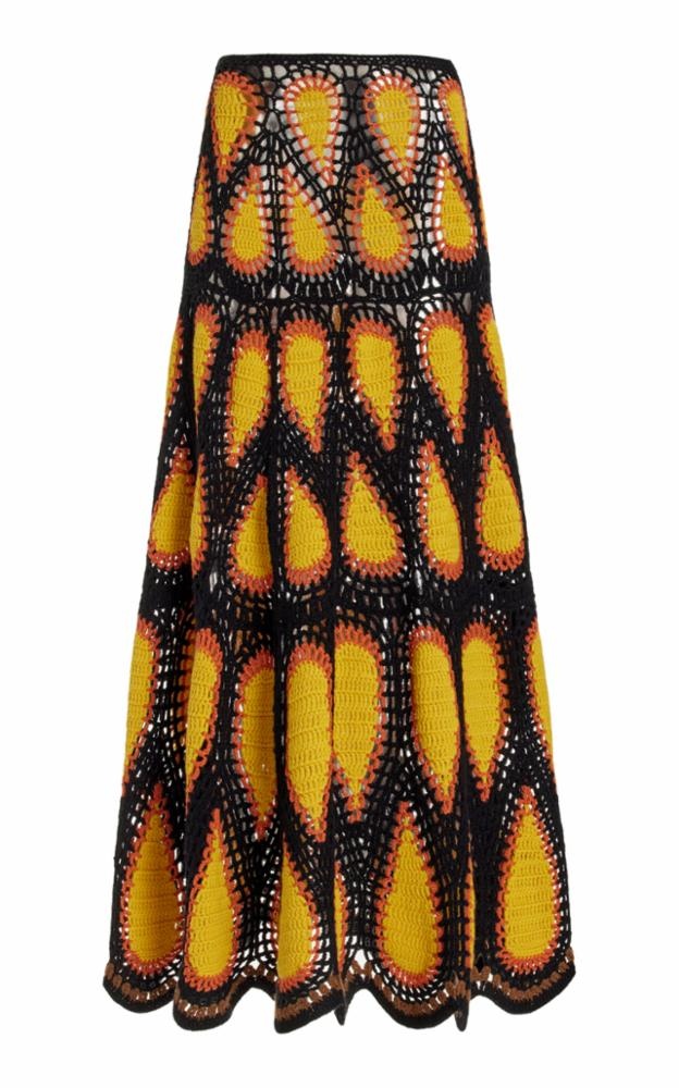A truly unique work of art, the Cleo Skirt is hand crocheted by Artisans in 100% cashmere. The pattern is based on a classic Peacock Crochet pattern. Soft and feminine, this skirt fits slim around the hips and then expands into a full sweep. It pairs beautifully with the Capps Top. Details: - 100% Cashmere - Made in China Size and Fit: Fits true to size. Model is 5'11"" and wearing a size Small.
