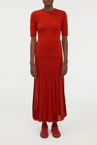 Debutante Knit Pleated Maxi Skirt in Antelope Orange Merino Wool