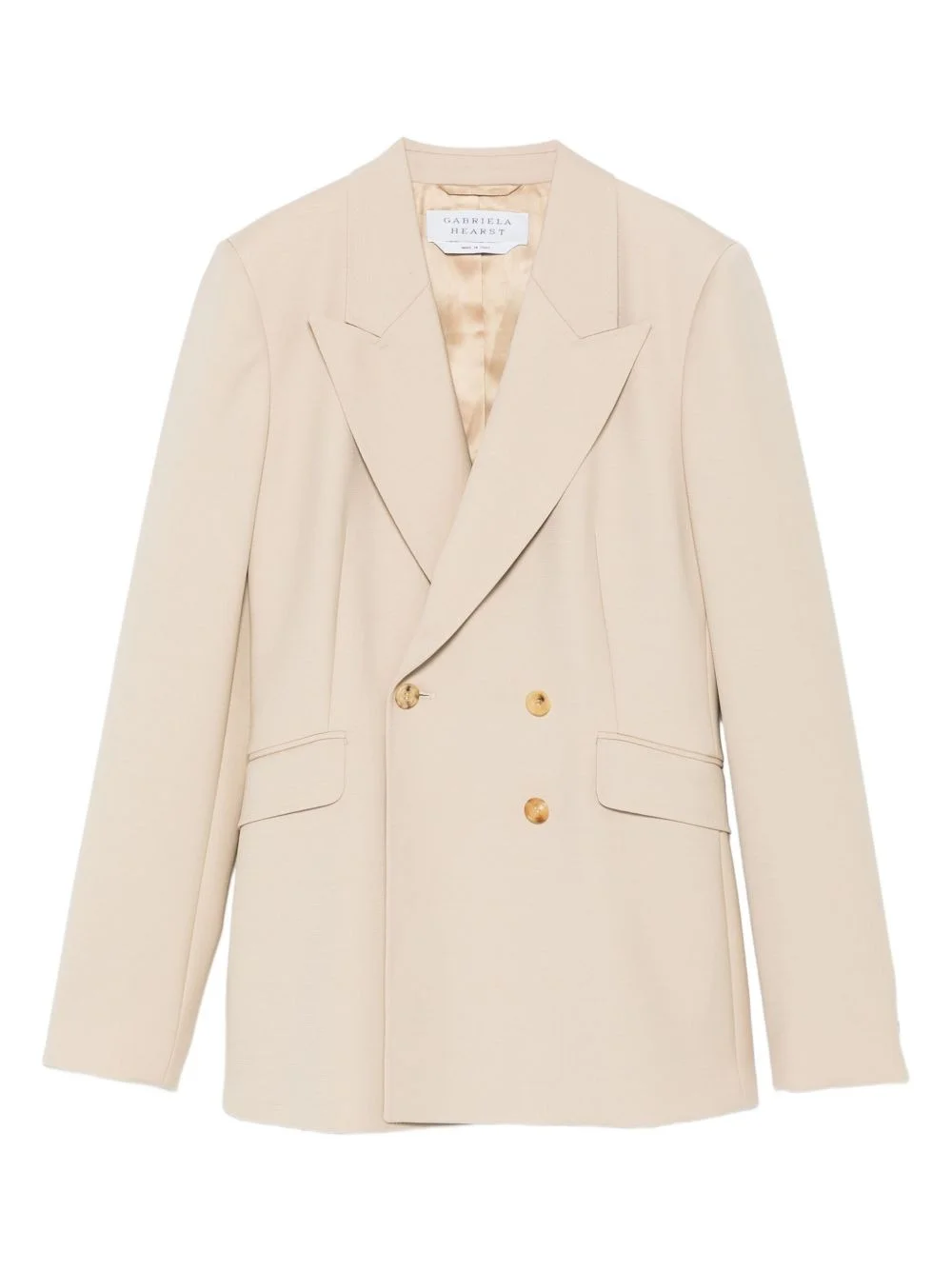 double-breasted blazer Highlights - Beige - Double-breasted - Peak lapel - Long sleeves Made in Italy Composition Lining: Cupro 100% Outer: Wool 100% SIZE & FIT Model measurements Height 5 ft 10 in(1.79 m) Bust/Chest 31.88 in(81 cm) Hips 35.43 in(90 cm) Waist 23.62 in(60 cm) Washing instructions Dry Clean Only