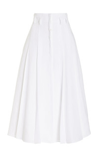 The Dugald linen skirt offers the perfect balance of ease and elegance in a hidden-placket, button-front style. A multi-pleat detail front and back opens up with movement and flare, contrasting to the fitted waist with self-belt and buckle. Details: - 100% Linen - Pleated - Midi-length hem - Made in Italy Size and Fit: Fits true to size. The model is 5'11" and wearing a size 38.