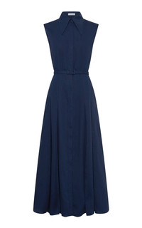 The Durand dress is punctuated with a sharp collar detail, slightly exaggerated with a longer length. Traditional dress shirt finishing and fine stitching make a sharp statement, creating an immaculate contrast against a fuller skirt created by front and back pleat details. In signature GH aloe linen. Details: - 100% Linen - Full Length - Fit and Flare - Adjustable-belt - Button closure on front and cuffs - Made in Italy