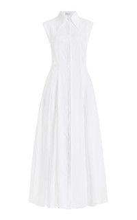 The Durand dress is punctuated with a sharp collar detail, slightly exaggerated with a longer length. Traditional dress shirt finishing and fine stitching make a sharp statement, creating an immaculate contrast against a fuller skirt created by front and back pleat details. In signature GH aloe linen. Details: - 100% Linen - Full Length - Fit and Flare - Adjustable-belt - Button closure on front and cuffs - Made in Italy Size and Fit: Fits true to size. The model is 5'11" and wearing a size 38.