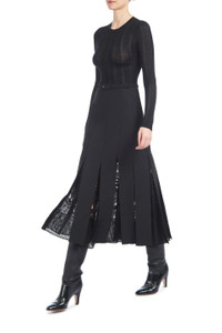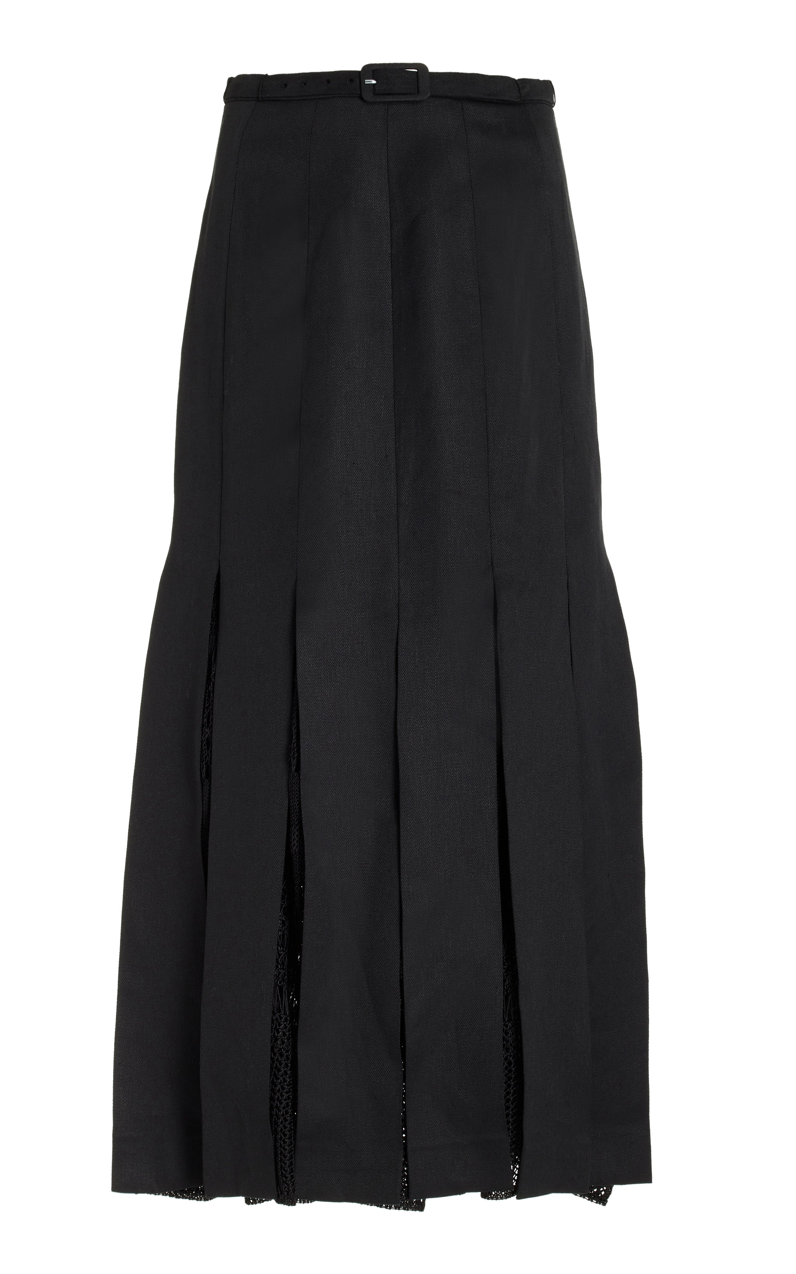 The Edith pleated skirt features delicate tonal macramé inserted godets, high-waisted and complete with a self belt, the sheerness of the inserts contrast against textured linen slub ground. Details: - Midi-length - Back zip fastening - 100% Linen - Italian sizing - Made in Italy Style and Fit: Straight fit. Model is 5'11" and wearing a size IT 38.
