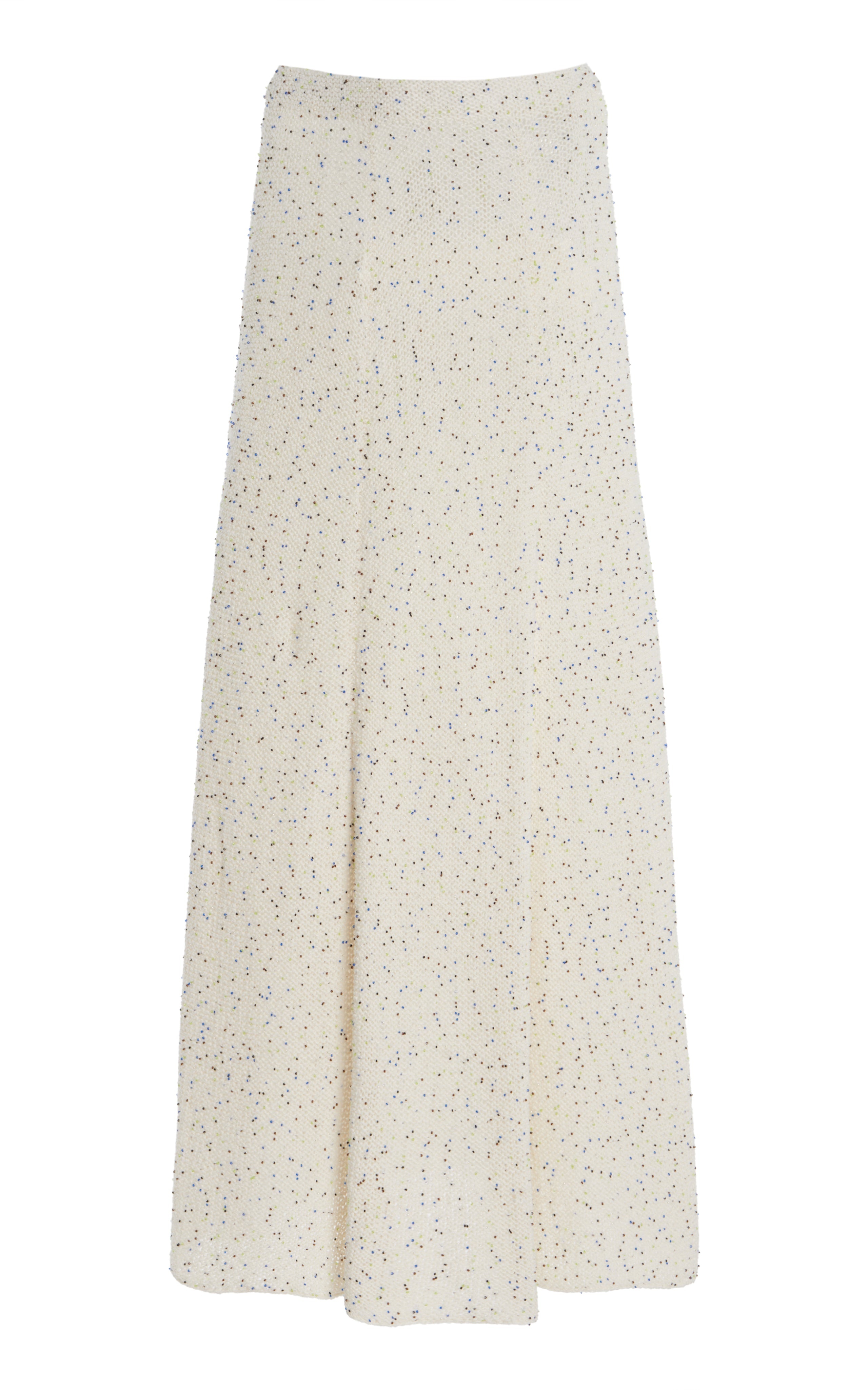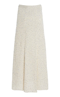 The Floris Skirt is handmade by artisans in Uruguay using a hand-flat knitting machine. The yarn is a combination of textural silk yarn and sleek silk yarn that has tiny glass beads spun onto it. The fit is slim through the hips and flares at the hem. Details: - 100% Silk - Full length - Pull-over - Elastic waistband - Made in Italy Size and Fit: Fits true to size. The model is 5'11" and wearing a size XS.