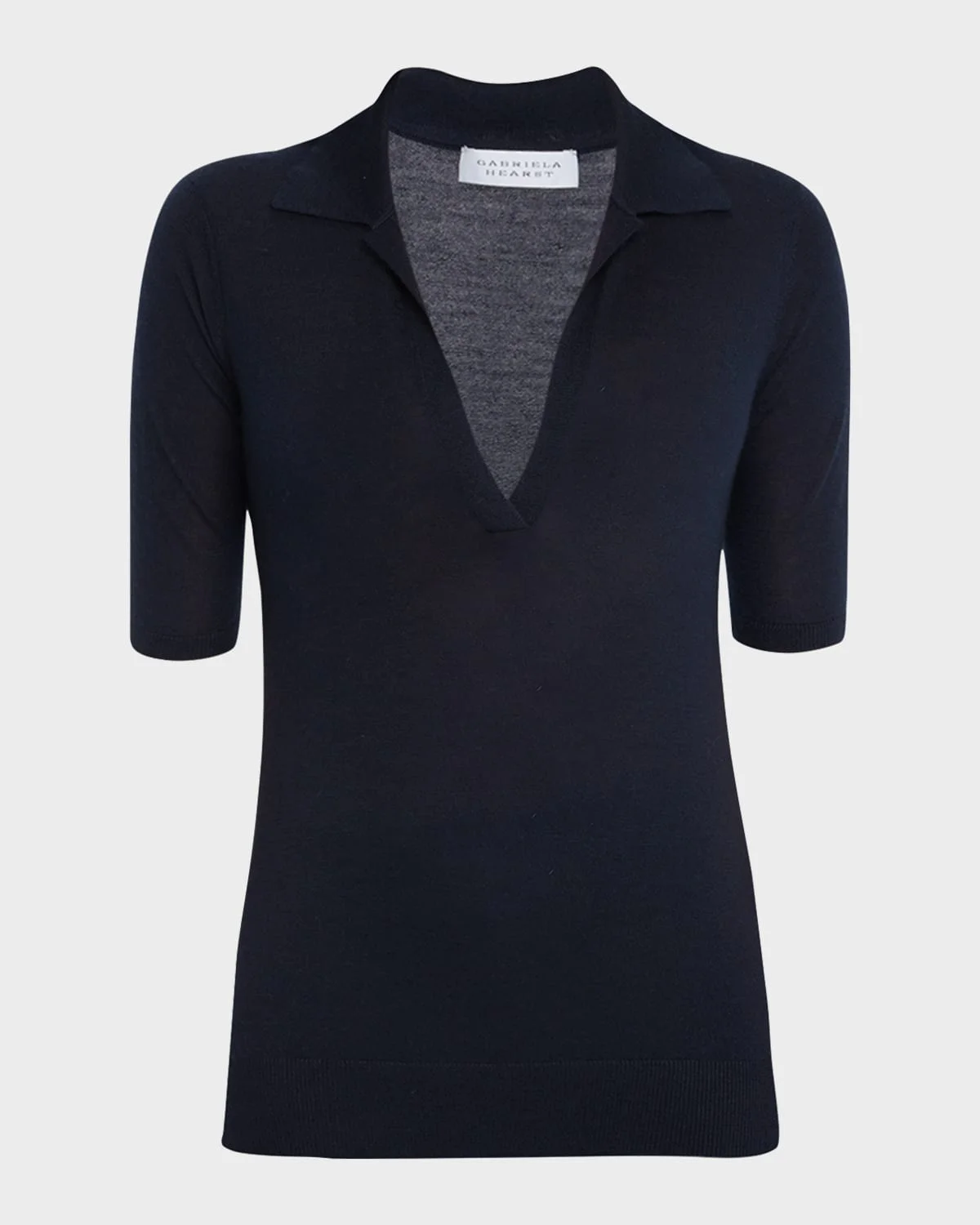 Gabriela Hearst "Frank" polo top in cashmere Spread collar; Vneckline Short sleeves Ribbed trim Hip length Pullover style Semifitted Cashmere/silk Made in Italy