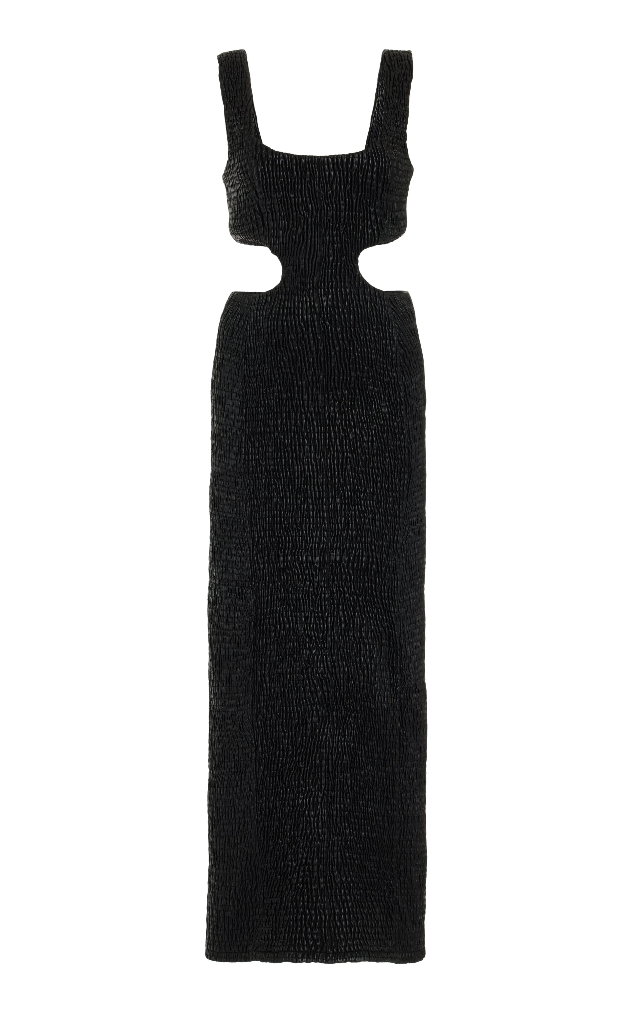 The Gal dress in leather carries signature, graphic cut-out side details, perfectly placed to flatter the form and create a unique modernity. Allover artisan ruching further enhances this precise, clean-cut style. Complete with a square neckline front and back and a slim pencil shape through the hips and sweep. Details: - 100% leather - Square neckline - Dual back-zip closure - Dual cut-out detail - Maxi hem - Made in Italy Size and Fit: Fits true to size. The model is 5'11" and wearing a size 38.