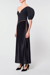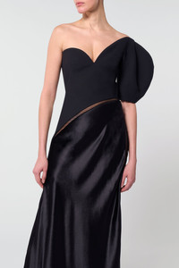 A structured wool silk cady sculpted corset with a full sleeve is combined in contrast with a liquid silk velvet bias cut skirt giving the Giulia dress a graceful yet powerful edge. Details: - 77% Wool, 23% Silk / 100% Silk - Built-in corset - Italian sizing - Made in Italy Size and fit: Fits true to size. Model is 5'11" and wearing a size IT 38.