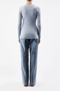 Our classic fine gauge knit cashmere silk crew neck is updated for Spring with a fine pointelle pattern in between the ribs. The fit is long and lean to elongate the form and finished with clean rib trims and mother of pearl buttons. Details: - 70% Cashmere, 30% Silk - Made in Italy Size and Fit: Fits true to size. Model is 5'11" and wearing a size 38.