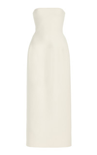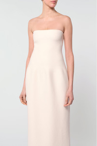 The Immanuel Dress is knit in 100% merino in Italy and then boiled to give it a dense, felted feel. The body is sculpted to be form fitting in the bodice, rounded in the hips, and straight throughout the skirt. It pairs elegantly with the Katlin Jacket. Details: - 100% Merino wool - Slim fit - Strapless - Concealed back-zip closure - Made in Italy Size and Fit: Slim Fit. Fits true to size. The model is 5'11" and wearing a size Small.