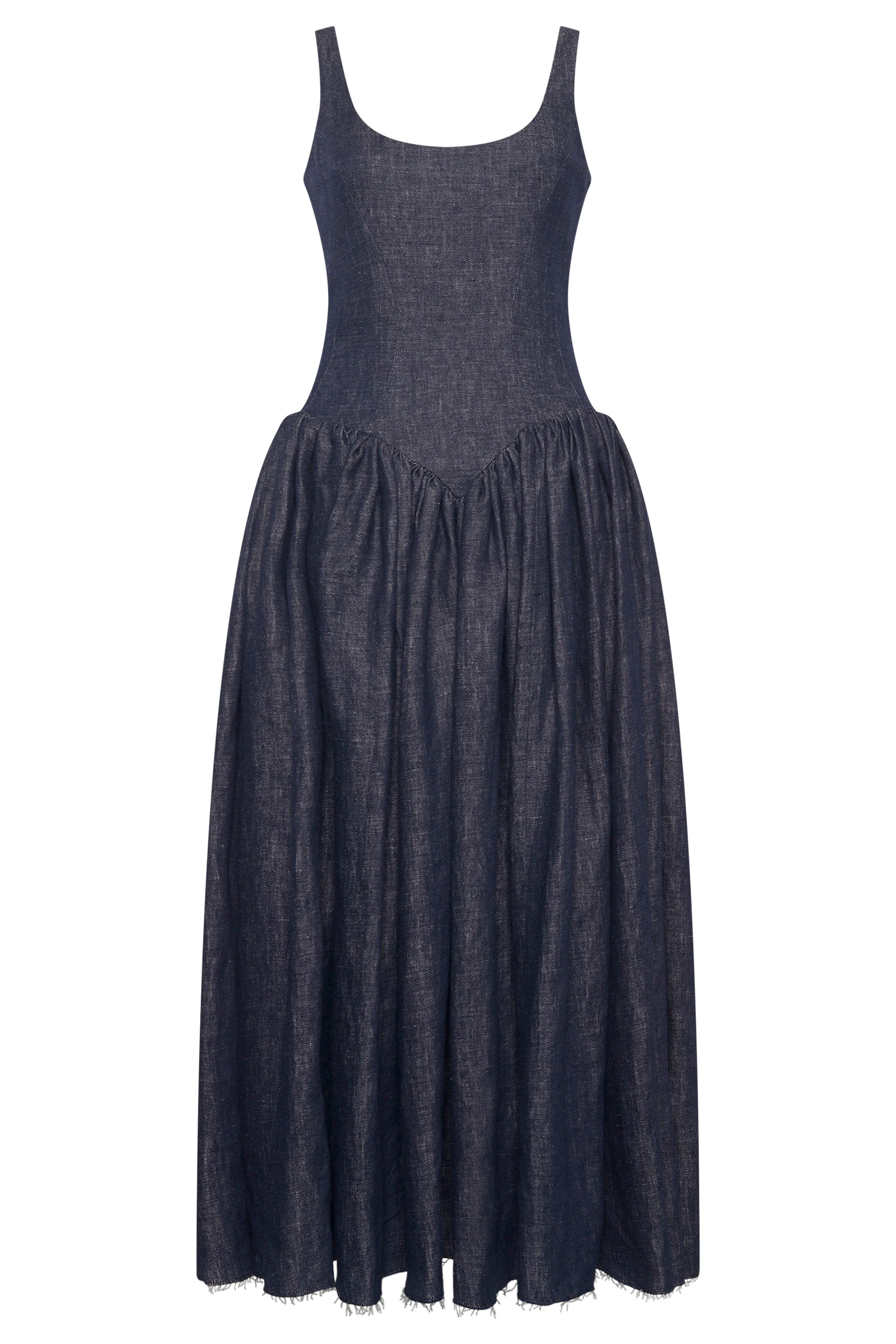 The Isai Dress features a tank silhouette with a ruched skirt and scoop back crafted in stone washed denim with invisible bonded seams. Details: - 100% Denim - Sleeveless - Structured Bodice