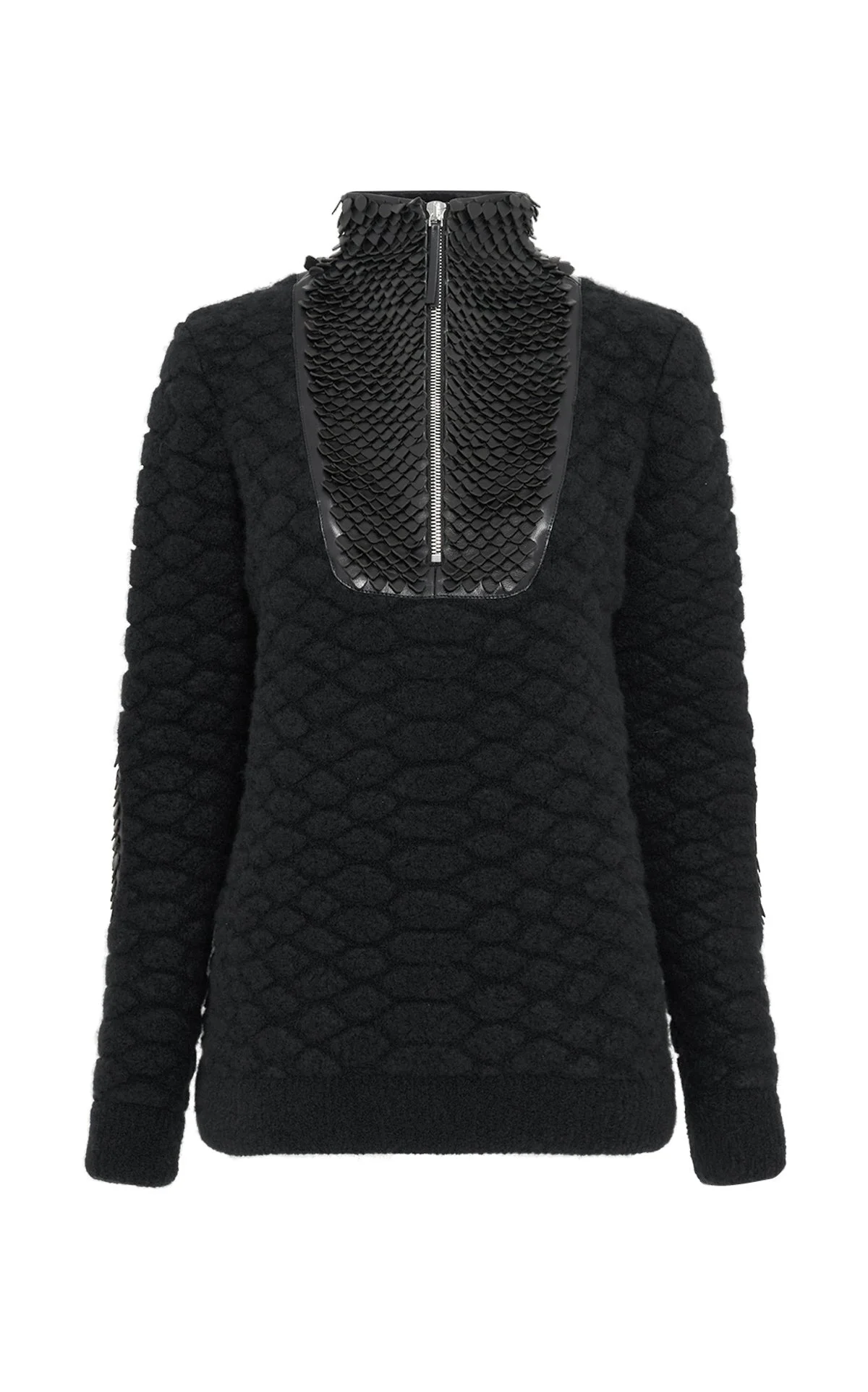 The Isha Sweater in cashmere offers the soft and supple knit coupled with the structured and raw leather funnel neck, both the cashmere and leather detailed to mimic snakeskin, as themed in the collection echoing the work of goddess archaeologist Marija Gimbutas Details: - 100% Cashmere - Mock-neck - Front zipper closure - Italian sizing - Made in Italy