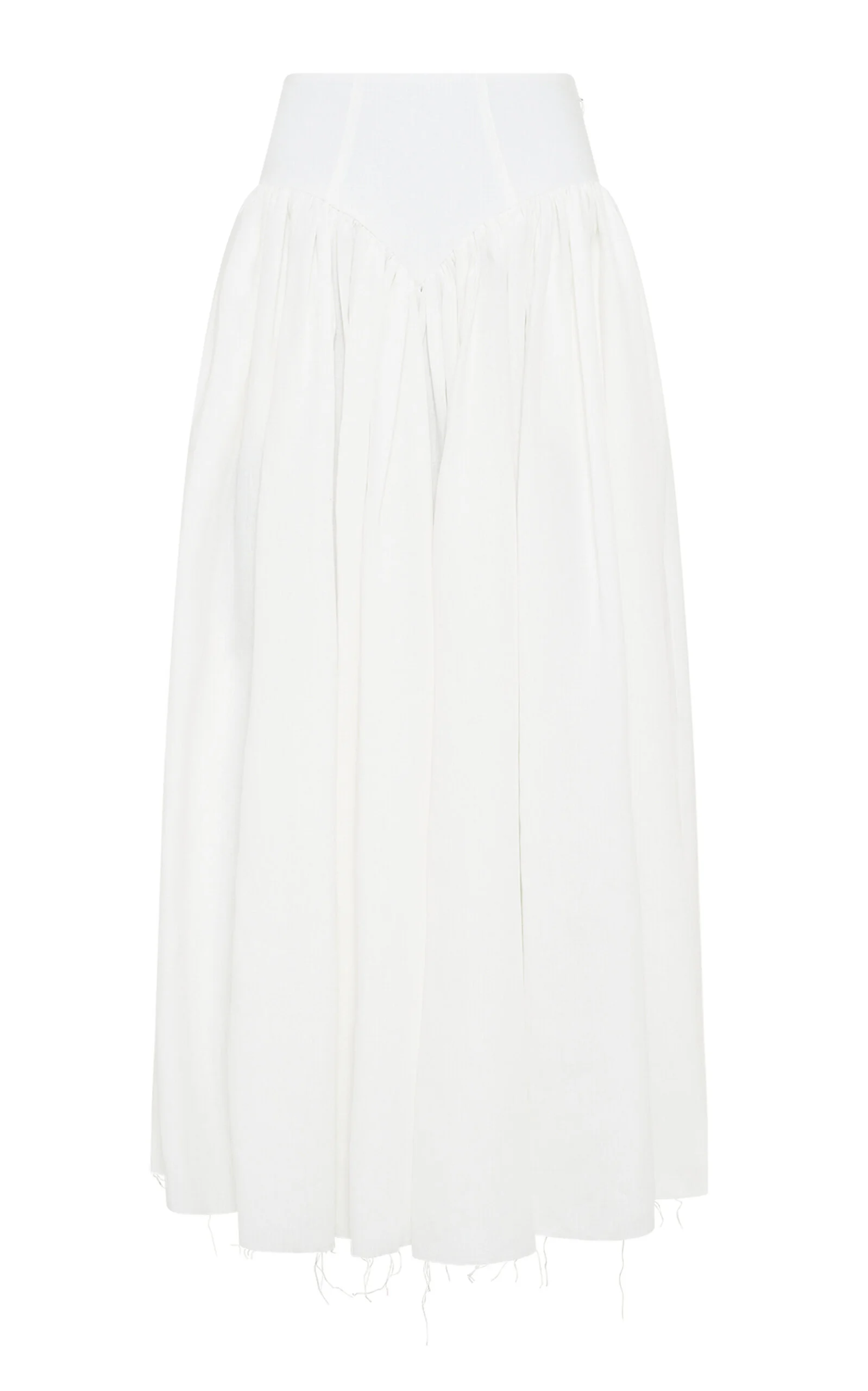 The sustainability pioneer is the industry leader in luxurious clothing and accessories that strike an understated elegance, yet are crafted with the utmost attention-to-detail and commitment to ethics. The 'Juniper' skirt is made from breathable linen and designed with an ultra-flattering V-cut waist that balances its voluminous skirt. PRODUCT DETAILS - Resort '26 - Concealed zip fastening - Composition: 100% Linen - Dry clean - Made in Italy SIZE & FIT - Our model is wearing a size IT 38 - Model is 5'10" with a 31" bust, 23.5" waist, and 33.5" hip