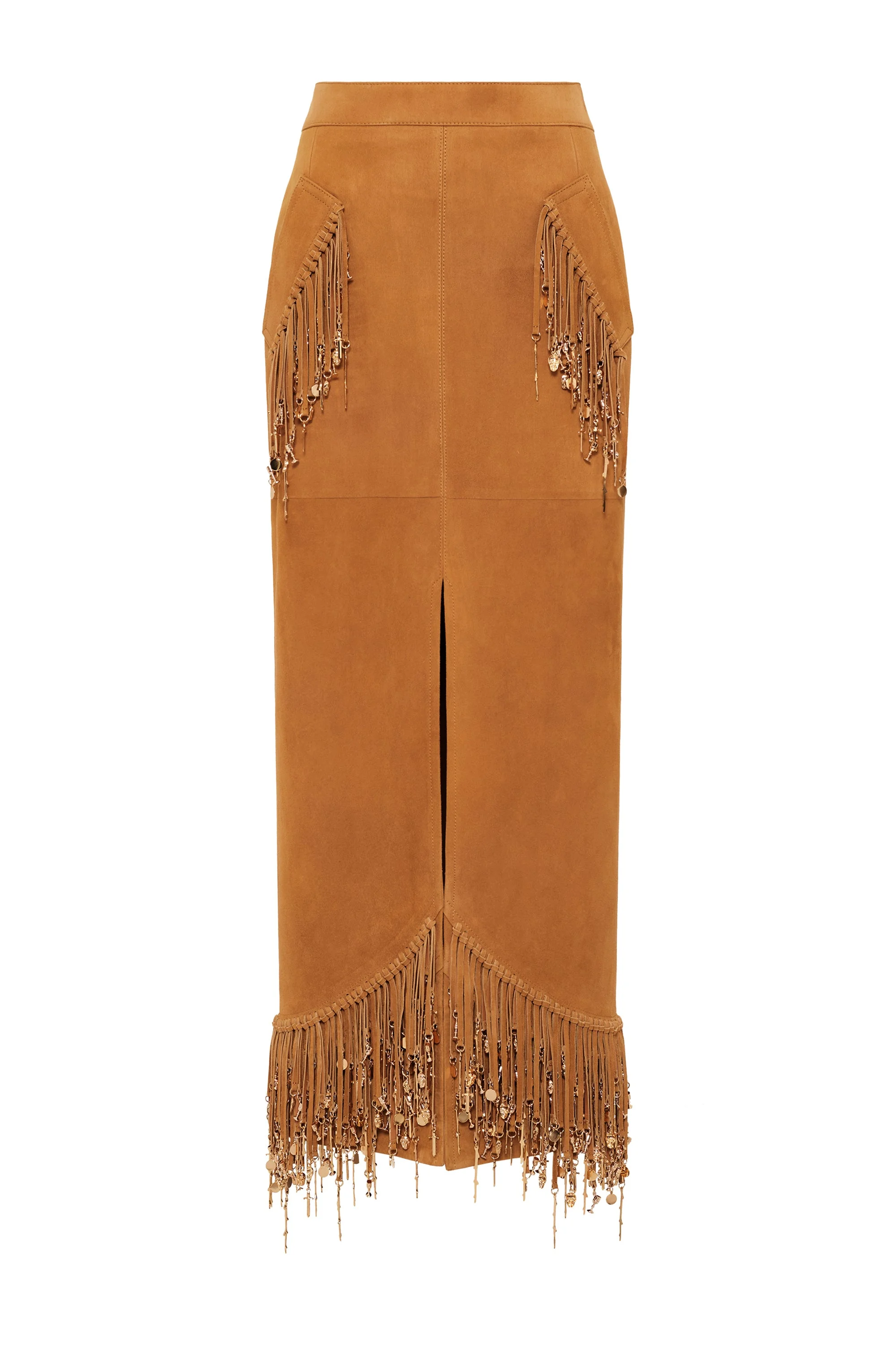Kalyan Fringe Maxi Skirt in Cashew Suede with Charms