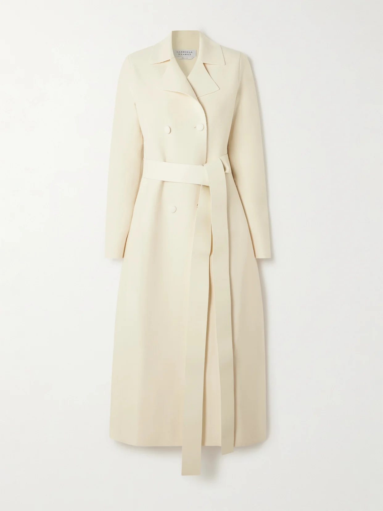 Gabriela Hearst's Fall '24 collection is inspired by the work of painter Leonora Carrington. Made from ivory wool, this 'Kant' coat has a double-breasted shape that cinches with a tonal leather belt. Look closely and you'll notice it has a single gold-tone button.