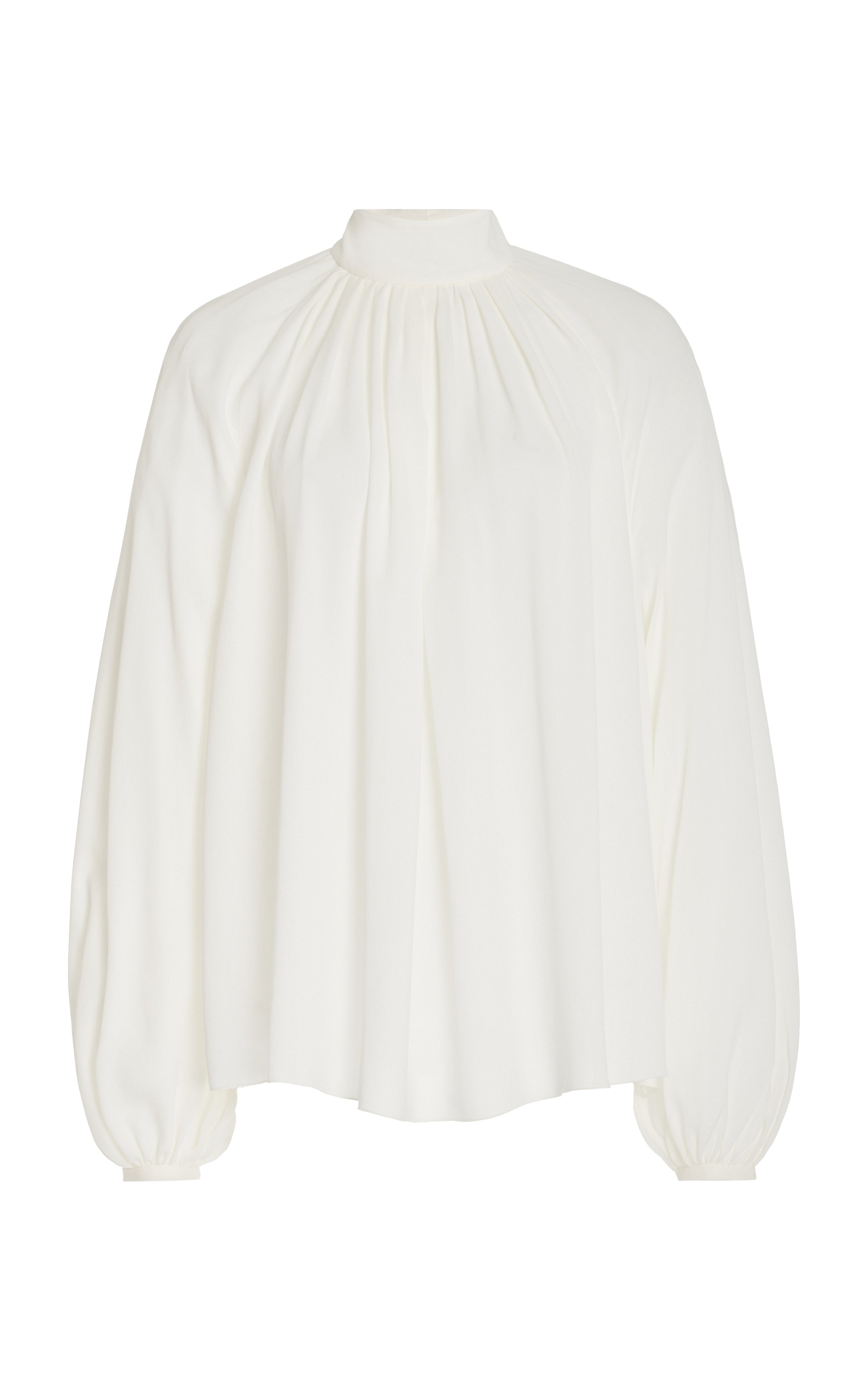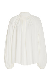 The Gabriela Hearst Kiian top flows elegantly from the high turtle-neck collar with delicate tucks. The fuller sleeve detail finishes in a cuff with covered buttons. Details: - 100% Silk - Turtleneck - Pleated - Button cuffs - Relaxed fit - Shirttail hem - Made in Italy Size and fit: Relaxed fit. Fits true to size. The model is 5'11" and wearing a size 38.