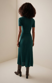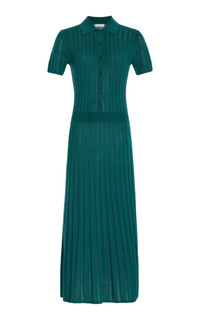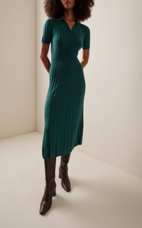 The sustainability pioneer is the industry leader in luxurious clothing and accessories that strike an understated elegance, yet are crafted with the utmost attention-to-detail and commitment to ethics. Knit from a beautifully ribbed cashmere-silk, the 'Elvis' dress features a collared button-front bodice that falls to a gently flared skirt. PRODUCT DETAILS - Resort '25 - Button fastenings along front - Composition: 70% cashmere, 30% silk - Designer color: Emerald - Dry clean - Imported SIZE & FIT - Our model is wearing a size Small - Model is 5'10" with a 31.5" bust, 23.5" waist, and 35" hip - Designed for a slim fit