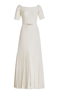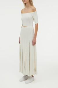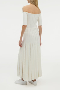 Knit in extrafine merino wool, the Kurt off-the-shoulder Dress has a slim body with dramatic pleats in the skirt. Inside each pleat is a pointelle pattern that gives an airy transparency throughout the skirt as it moves. The fit is slim in the body and hips, then flared at the hem. Details: - 100% Merino Wool - Off-the-shoulder - Horsebit Self-belt - To-the-elbow sleeves - Pointelle pleats - Slim fit Size and Fit: Fits true to size. The model is 5'11" and wearing a size Small.