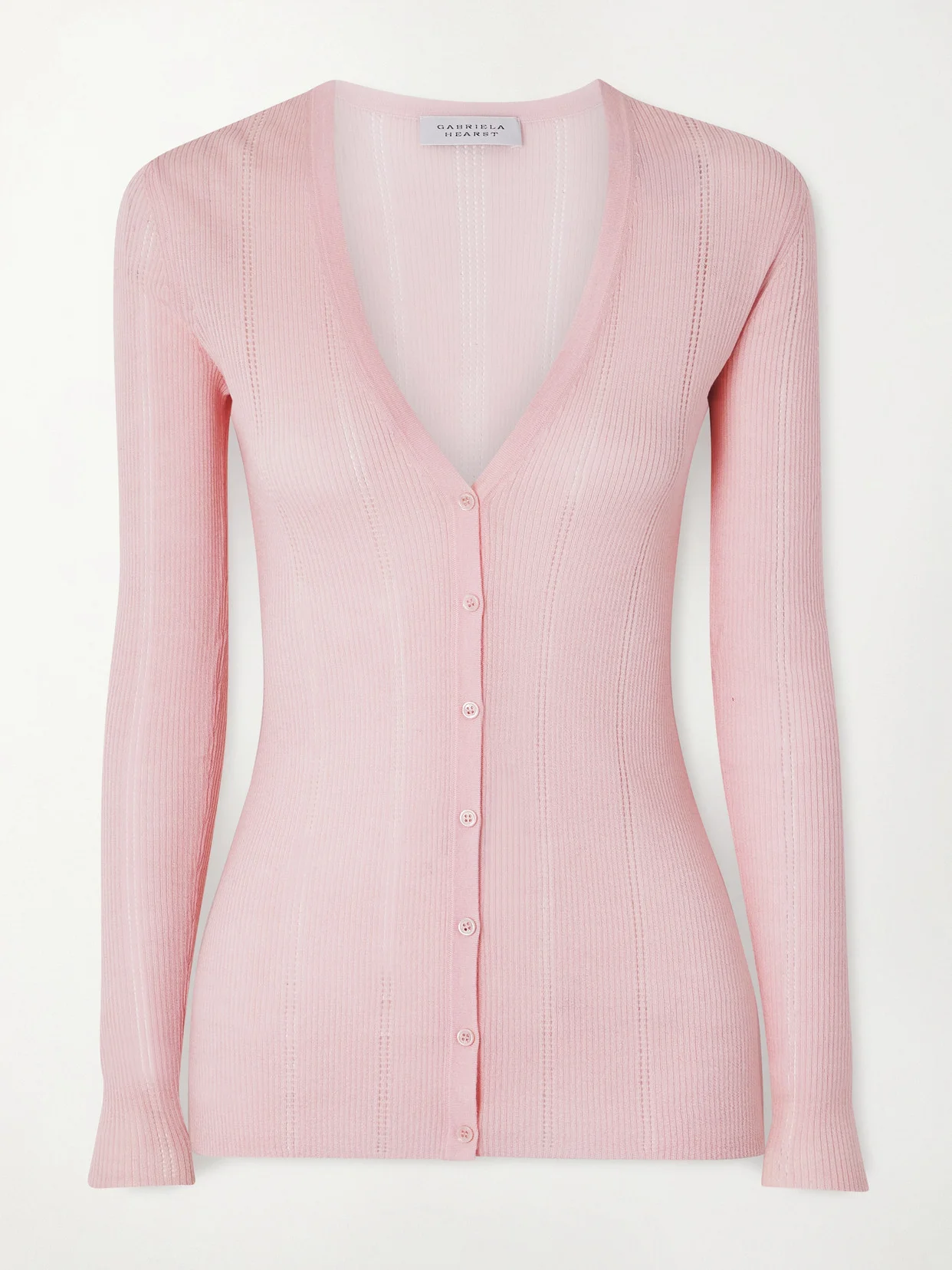Gabriela Hearst's 'Lillian' cardigan has been knitted with vertical pointelle stripes, giving it a slightly sheer, delicate feel. It's made for a close fit from pink wool and fastens with glossy buttons. Highlight the deep neckline with a pendant or two.