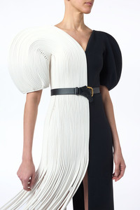 The Lysander dress creates a bold statement in Black & White Nappa leather and wool silk cady. A sculptural form is created by hand with leather tubes that are manipulated to create fuller sleeves and a contrasting slim fit through the waist and hips. Details: - 50% Lamb Leather, 50% Silk Wool Cady - Fit and flare - Puff sleeves details - V-neckline - Side-zip closure - Made in Italy