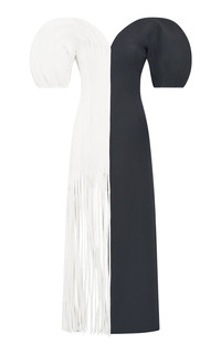 Lysander Fringe Midi Dress in Ivory Nappa Leather & Black Wool Silk Cady