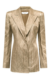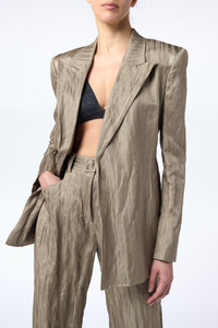 Soft metal crinkled silk comprised of silk and metal is patterned into the Mairi blazer; a classic, clean form devoid of hardware detail. Finished with a traditional pick stitch edge. Details: - 86% Silk, 14% Metallic fiber - Dual lapels - Pick stitch detail - Made in Italy