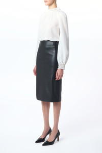 The Manuela pencil skirt embodies a slim, clean flattering form. Crafted in 100% leather, this graphic piece subtly celebrates the material's distressed, modern texture. Details: - 100% Lamb leather - High-rise - Midi-length - Slim fit - Made in Italy