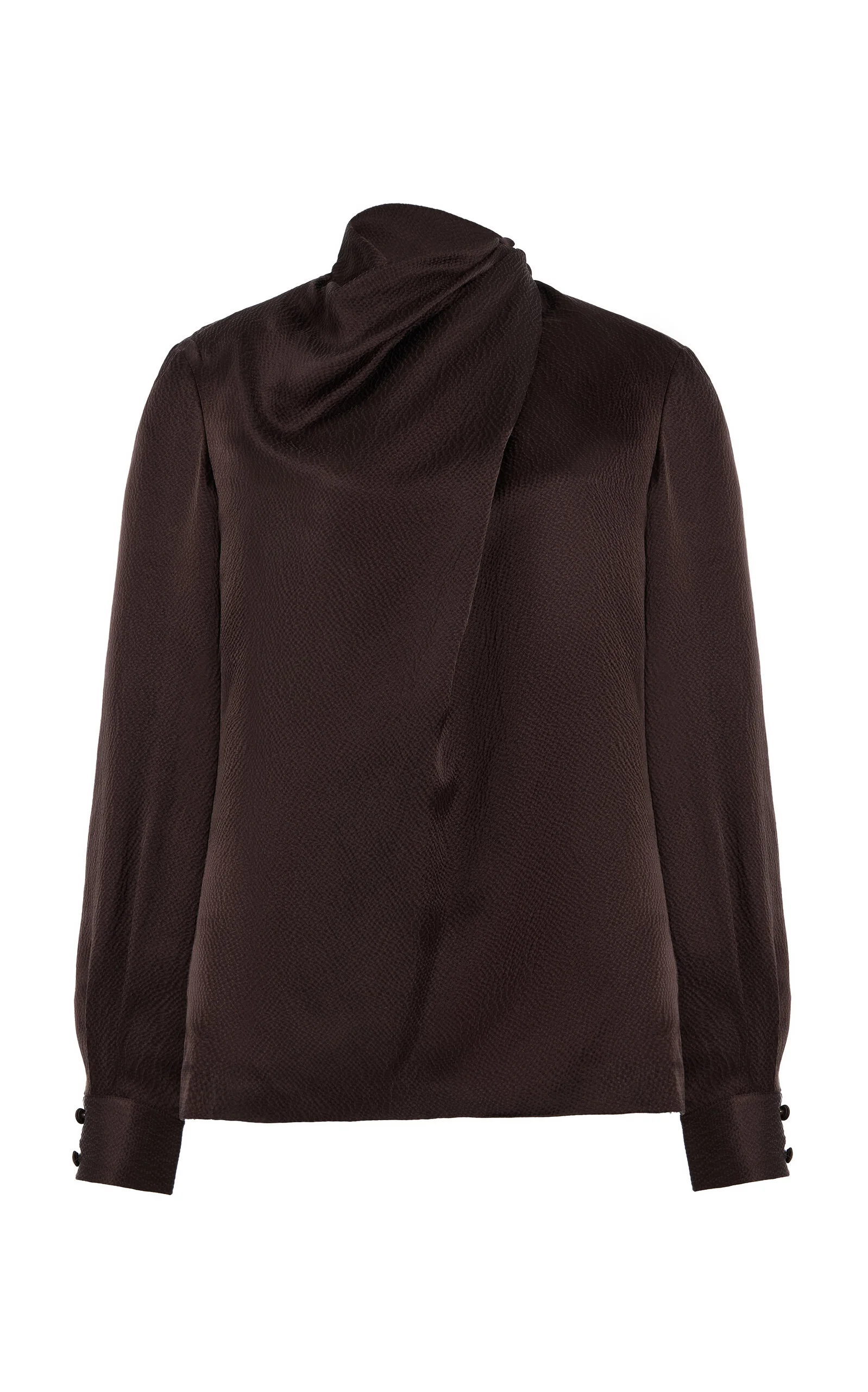 The sustainability pioneer is the industry leader in luxurious clothing and accessories that strike an understated elegance, yet are crafted with the utmost attention-to-detail and commitment to ethics. Made from luxurious silk crepe, the 'Marcela' top features a high-cut cowl neck that creates an elegant drape through the front. Tuck it into the matching Vargas pant. PRODUCT DETAILS - Resort '26 - Slip on - Composition: 100% silk - Designer color: Chocolate - Dry clean - Made in Italy