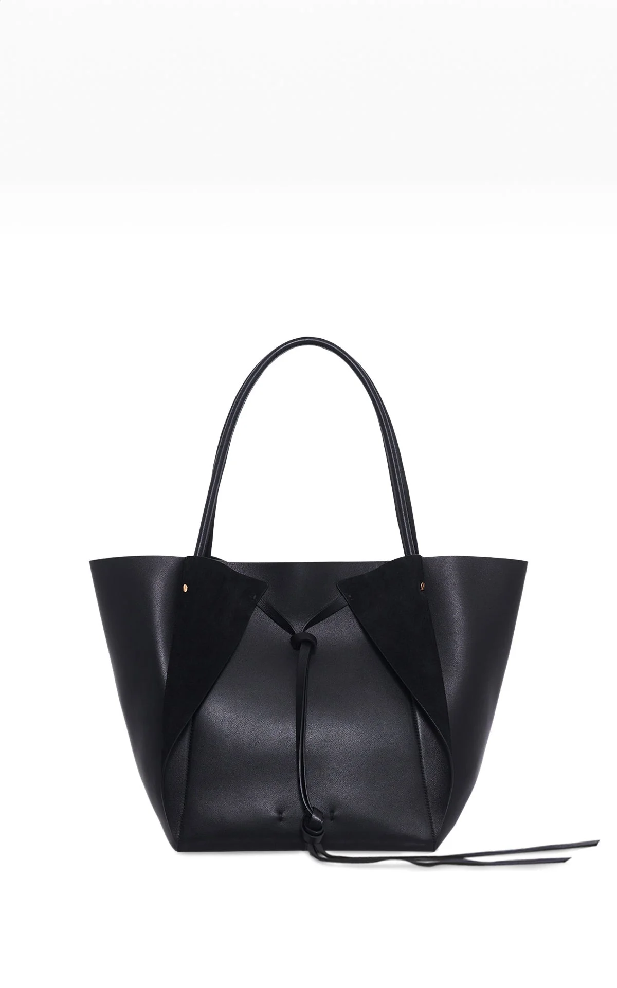 Named after archaeologist Marija Gimbutas, the Marija Tote is a carryall inspired by her work uncovering goddess-centered cultures. Made from lamb leather and with suede panels that fold in like wings, the shape suggests strength, protection, and quiet power. The central knotted tie nods to ancient spiral and snake motifs often found in her research—symbols of life, connection, and renewal. Details: - 100% Lamb Leather Exterior - 100% Calf Suede Lining - Includes removable pouch - Tie-Detail - Made in Italy - Length: 18" | 457.2 mm - Height: 12.5" | 317.5 mm - Width: 7.5" | 190.5 mm