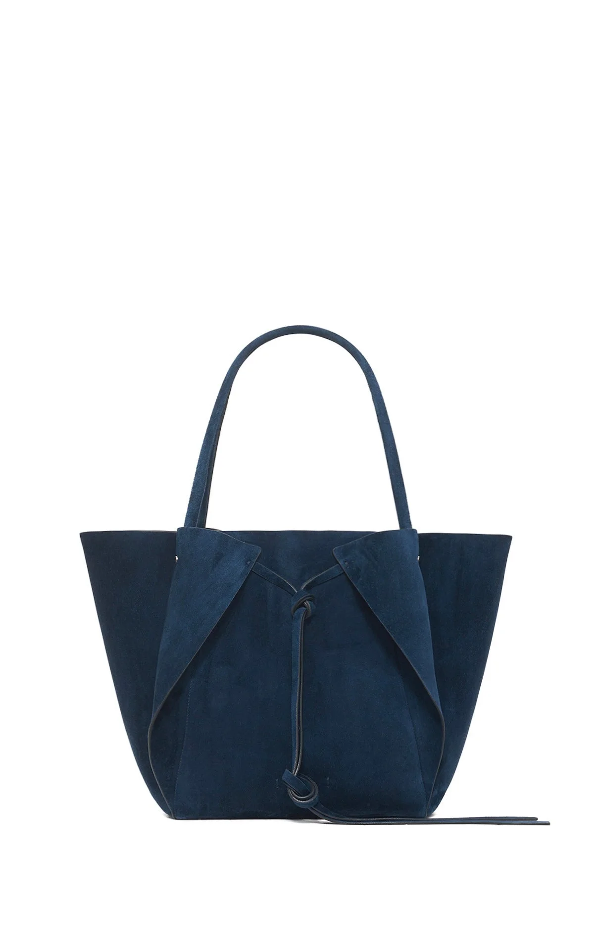 Named after archaeologist Marija Gimbutas, the Marija Tote is a carryall inspired by her work uncovering goddess-centered cultures. Made from suede and with suede panels that fold in like wings, the shape suggests strength, protection, and quiet power. The central knotted tie nods to ancient spiral and snake motifs often found in her research—symbols of life, connection, and renewal. Details: - 100% Calf suede exterior - 100% Calf suede interior - Includes removable pouch - Tie-Detail - Made in Italy - Length: 18" | 457.2 mm - Height: 12.5" | 317.5 mm - Width: 7.5" | 190.5 mm