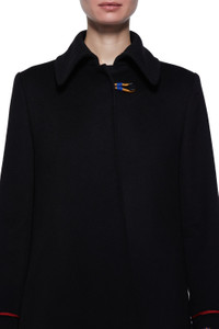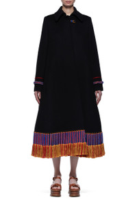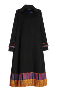 Based on a riding coat style this re-puposed cashmere coat with collar detail skims the upper body before sweeping out towards the hemline which is dramatically punctuated with hand-made silk yarn tassle detail. Details: - 100% Cashmere - Made in New York Size and fit: Relaxed fit. Fits true to size. Model is 5'11" and wearing a size 38.