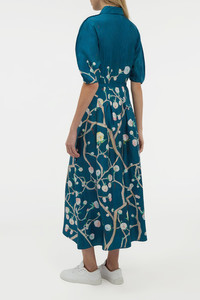 Maude Pleated Midi Shirtdress in Blue Multi Printed Silk Twill