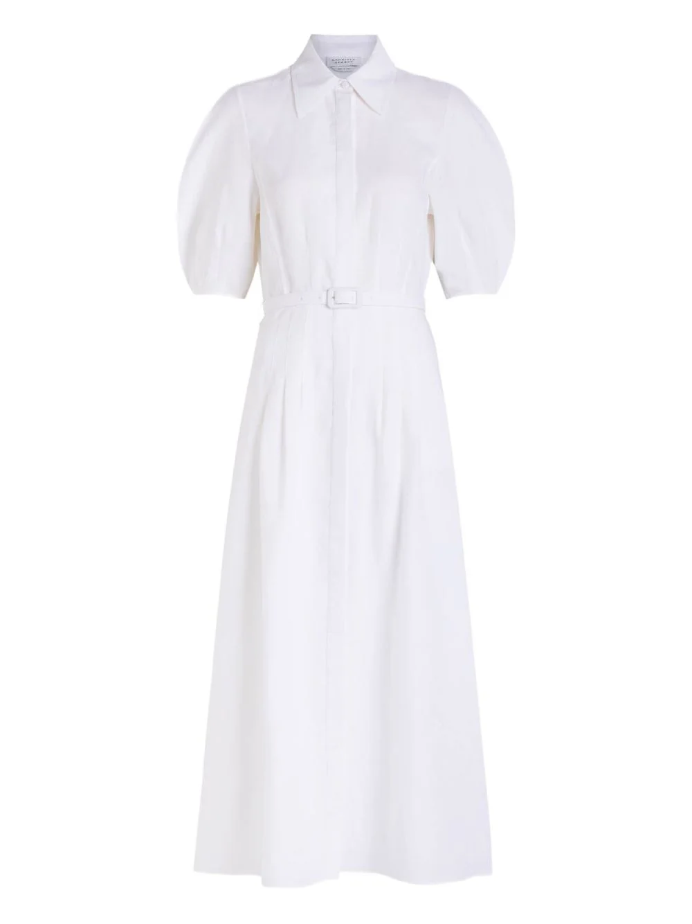 Maude puff-sleeve belted dress Highlights - White - Belted waist - Collared - Short sleeves - A-line - Button fastening Made in France Composition Fabric 100% Washing instructions Read Manufacturer Guidelines