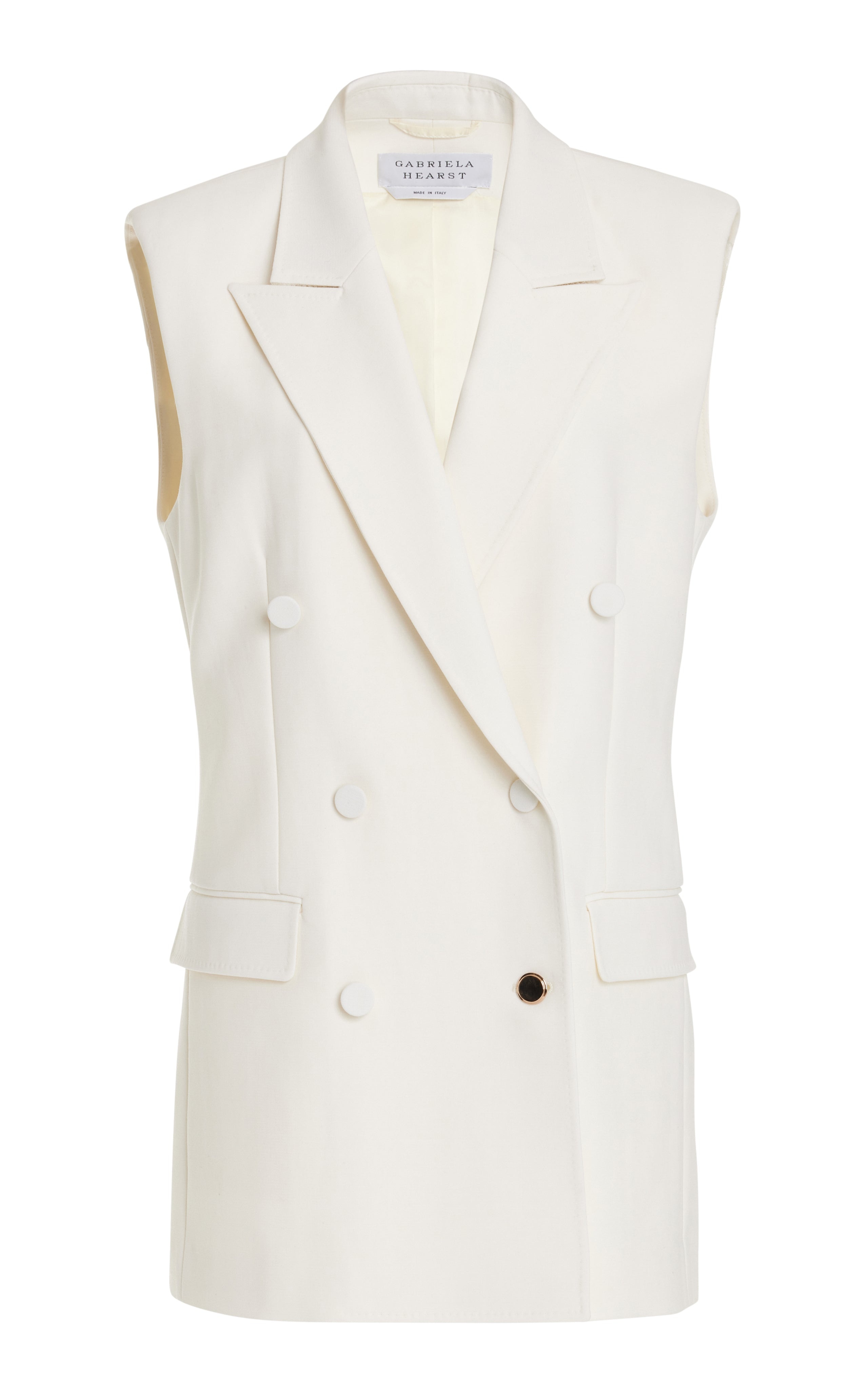 The Mayte Vest is a perfect sleeveless version of our signature bold blazer silhouette. With strong shoulder and double-breasted front closure, this style cuts a modern form. Details: - 73% Silk 27% Wool - Double-breasted - Two-tone buttons - Dual pockets - Back-vent - Midi-length - Made in Italy Size and Fit: Fits true to size. Model is 5'11" and wearing a size 38.