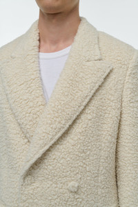 The Mcaffrey Coat brings cashmere sherpa to life in a tailored silhouette, imagined as a long double-breasted coat. Luxuriously soft yet refined; blending utilitarian warmth with elegant structure. Details: - 88% Cashmere,12% Silk - Dual pockets - Ribbed detail - Button-up closure - Italian sizing - Made in Italy