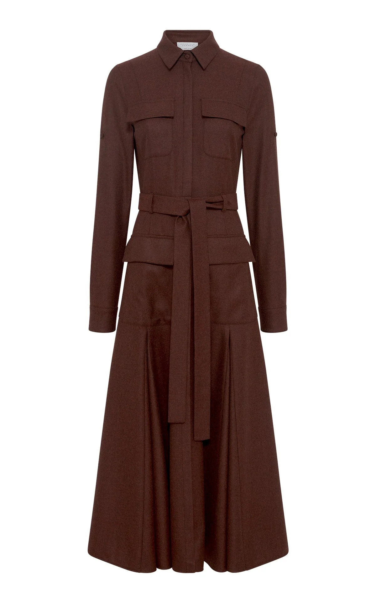 Derived from our classic Gabriela Hearst military style shirtdress, the Meyer Shirtdress flows with ease in wool cashmere flannel. Finished with inverted box pleats that flare open towards the sweep. Details: - 93% Virgin Wool (Australia/New Zealand/South Wales), 7% Cashmere - Full Length - Long Sleeve - Dual Breast Pockets - Dual Skirt Pockets - Point collar - Concealed button-down - Waist Belt with Belt Loops - Made in Italy